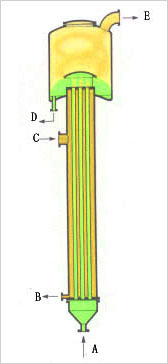这种蒸发器的特征是具有长的加热管(约为5~7M),但加热室和沸腾室之间的温度差也必须大,否则,蒸汽流的能量不足于输送液体和产生爬升的膜。 A:物料进口 B:冷凝水出口 C:蒸汽进口 D:浓缩液出口 E:二次蒸汽出口 降膜式蒸发器 在降膜蒸发器中,液体和蒸汽向下并流流动,需浓缩的液体预热至沸腾温度,均匀的液膜通过蒸发器顶上的液体分布装置进入加热管,在沸腾温度下向下流动并部分蒸发,往下运动引入的重力因并流的蒸汽流不断加强。